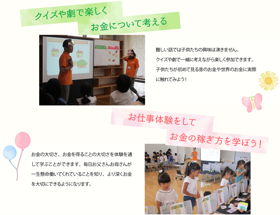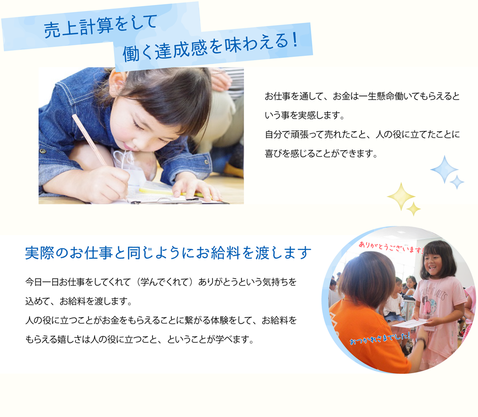 お仕事体験を通して働く大変さを知ることができるので「お金の大切さ」や「お金=ありがとう」に自然と繋がっていきます。