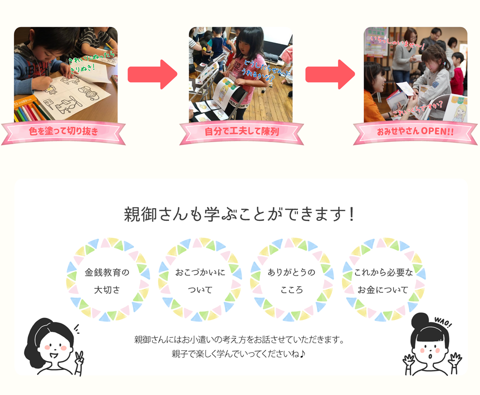 親御さんからも「お金やおこづかいのことを改めて考えるきっかけとなった」「親子共々大変勉強になった」「楽しみながら学べて、何より子供がすごく楽しそうで嬉しかった」などご感想を頂き、私達も嬉しいです。お子さんに「お金の大切さ」「親への感謝」を伝えていくことが私達の役目です。