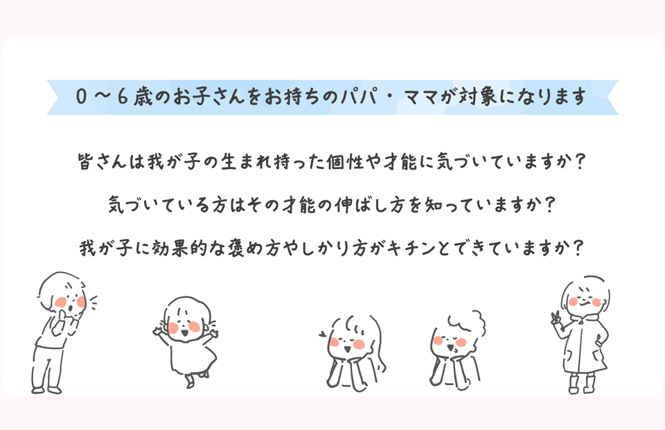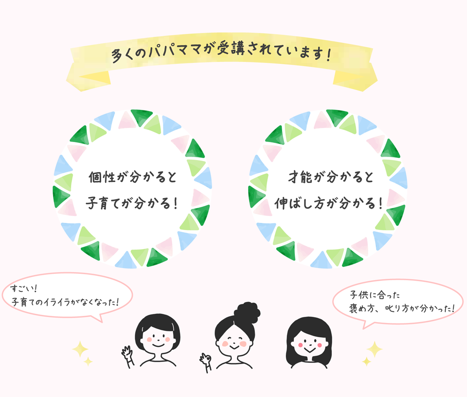 「子供の才能発見講座」は、子どもの個性だけではなく、子育て中のパパ・ママの個性についても知っていただける内容になっています。