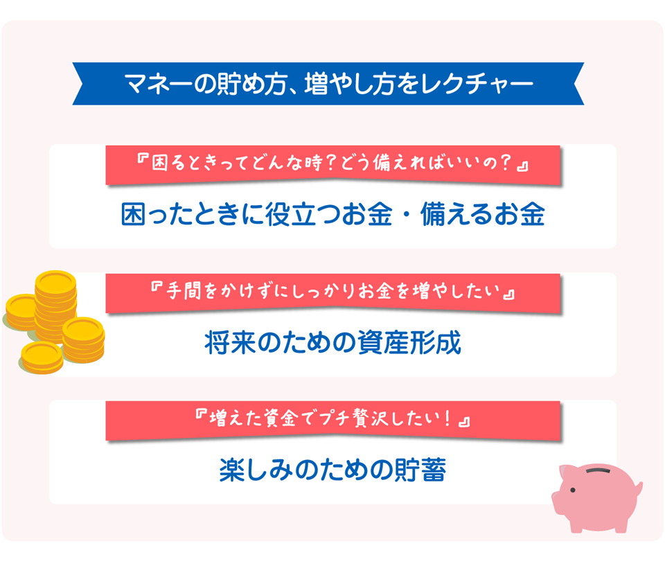 プロに任せてしっかり増やす「老後」のための賢い貯蓄法、目的別の金額商品の選び方、プロだから知っている最新の業界情報や無理せず貯めれる保険の賢い活用法などを学べます。